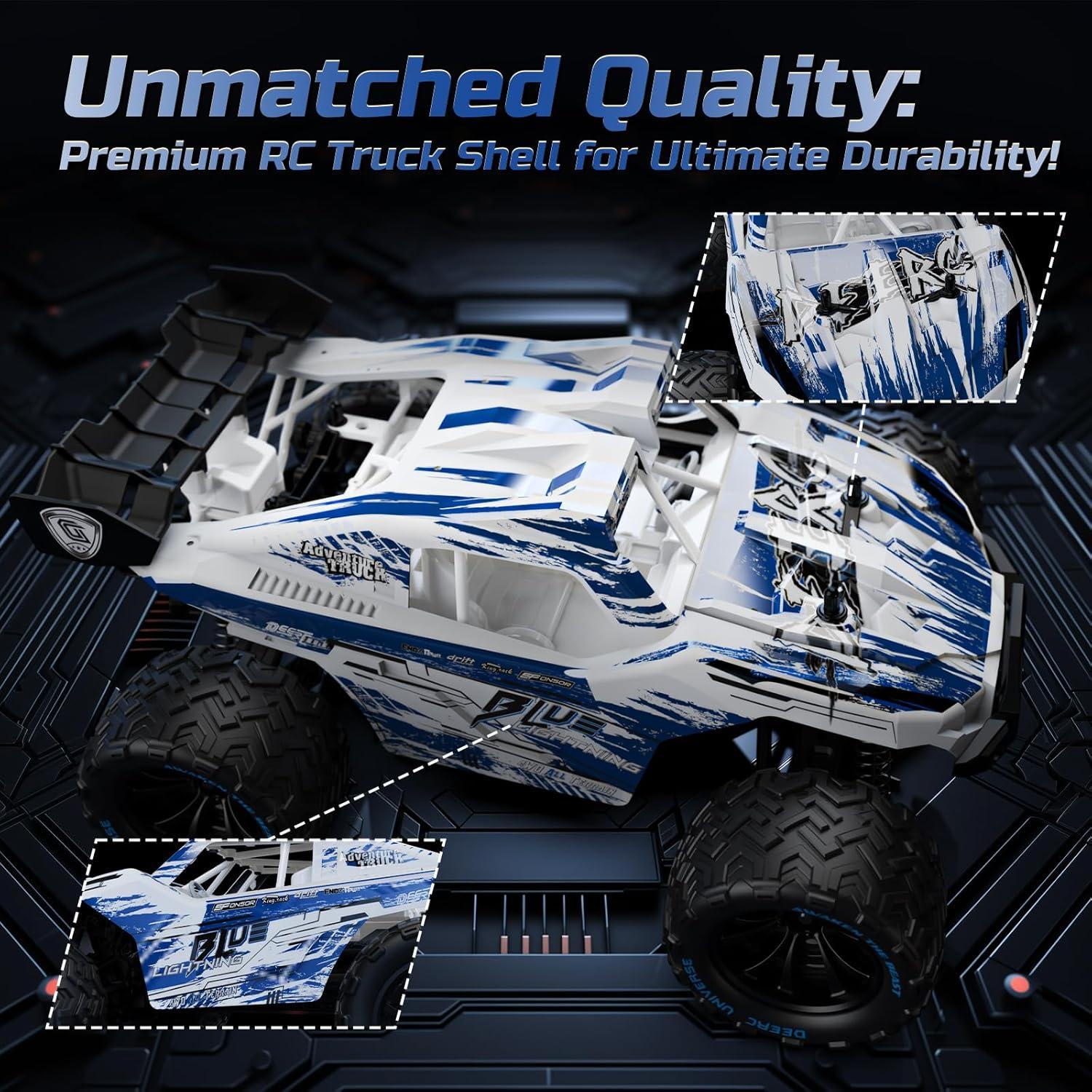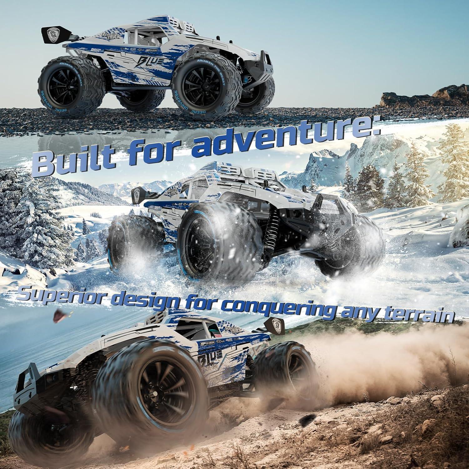 Built to Conquer: Featuring a robust metal drivetrain with enhanced components like upgraded dog bones, a metal differential, and reinforced gears, this RC car is built for extreme durability and long-lasting performance. Equipped with aggressive non-slip rubber tires, it’s ready to tackle any challenge with ease. Unleash the monster truck's full speed potential and experience the ultimate in high-speed racing excitement.