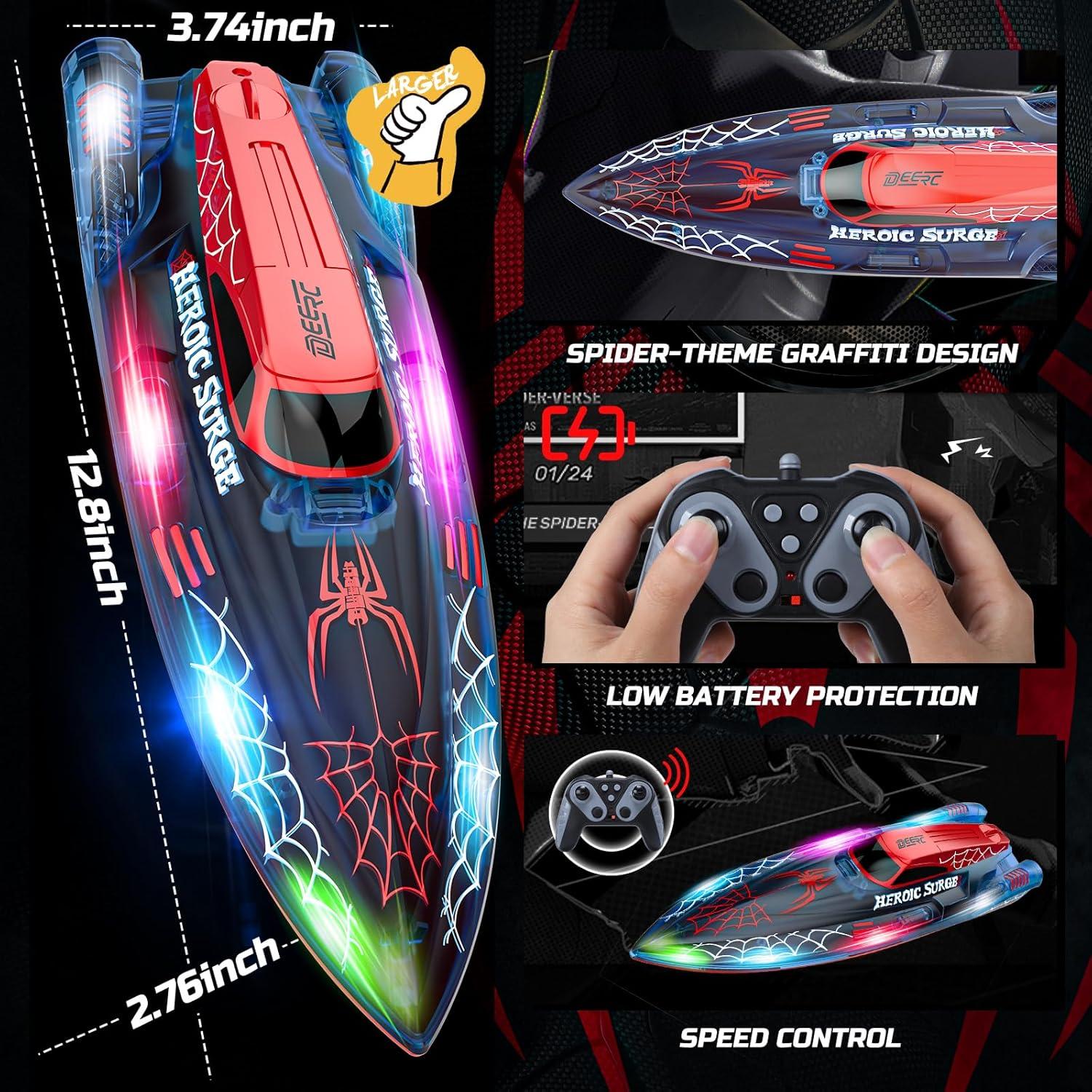 Cool Spider RC Boat – Bigger, bolder, and brighter! Measuring 12.8 inches long—larger than the standard 9.8-inch RC boats—this spider-themed cruiser is built to stand out. Why settle for ordinary remote control boat when you can dominate the water in style? Perfect for night adventures, it's the ultimate cruiser for endless fun on the water!