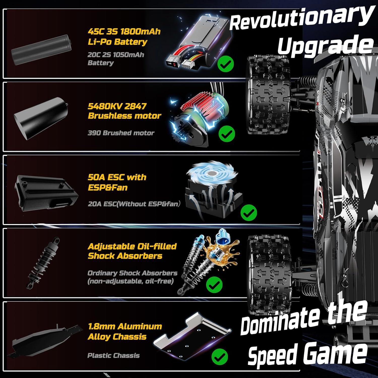 50A ESC & ESP Control – Professional-grade 50A electronic speed controller ensures stable power output under heavy loads. The integrated cooling fan prevents overheating, while the advanced Electronic Stability Program (ESP) keeps the truck running straight at high speed, reducing rollover risk.