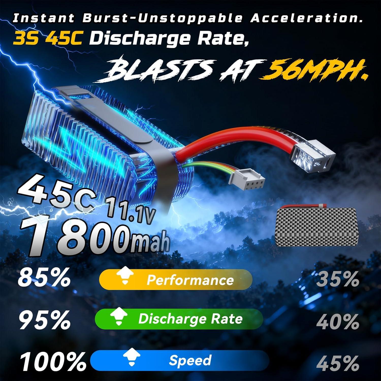 56+ MPH Extreme Speed – Equipped with a 5480KV 2847 brushless motor and high-discharge 45C 3S LiPo battery, this 1/16 scale RC car delivers adrenaline-pumping performance. GPS-tested top speed exceeds 56 MPH, offering race-level acceleration and thrills for true RC enthusiasts. Dual high-capacity LiPo batteries provide up to 40 minutes of non-stop run time, keeping the excitement going longer.
