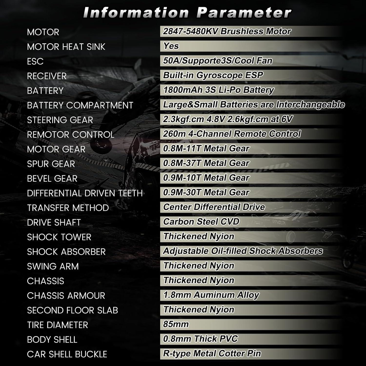 Reinforced CNC Alloy & Metal Drivetrain – Built like a tank with 1.8mm CNC-machined aluminum chassis blocks, hardened steel pinion, 0.8M/37T precision metal spur gear, and sealed 0.9M bevel gears with front and rear differentials. This reinforced setup boosts durability by 90%, delivering extreme toughness across any terrain.