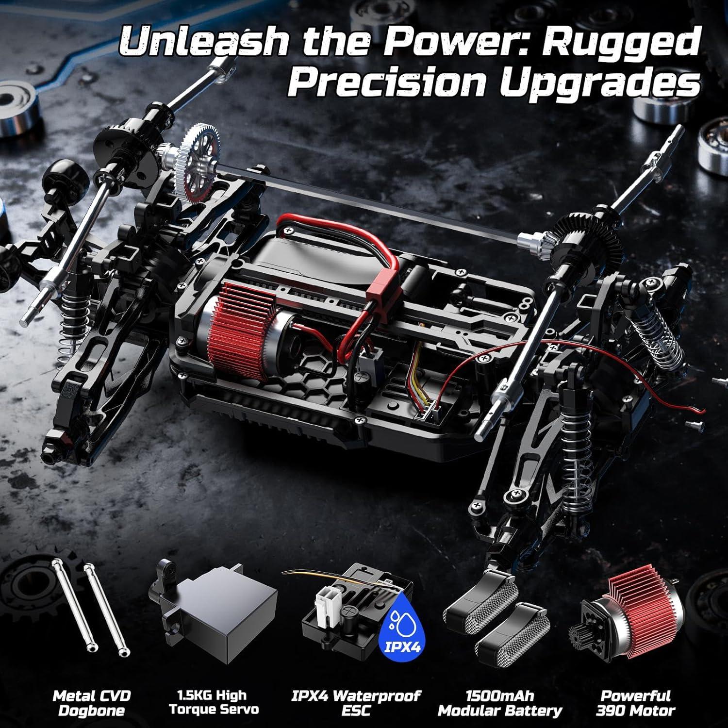 【Reinforced Metal Upgrades, Impact Resistance】Engineered to be unstoppable, this remote control truck boasts a durable chassis with metal drive shafts, alloy dog bones, and other matal parts like reinforced axles for high-speed driving. A protective roll cage, strengthened bumpers, and secure body pins lock it all down. Plus, with a spare tire on board, it's built to survive crashes and rollovers with ease—so you can maximize playtime and minimize repairs.