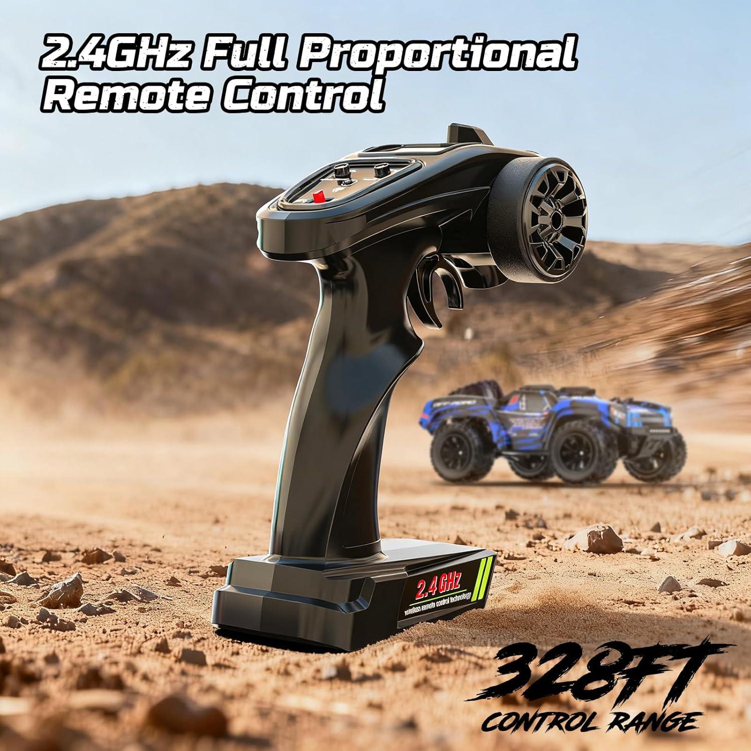【2.4GHz Full Proportional Remote Control】This rc car is paired with a reliable 2.4GHz remote control system, offering stable signal transmission without interference. With an impressive 328-foot control range, you can confidently drive the car from a distance, making it perfect for larger play areas or outdoor adventures.