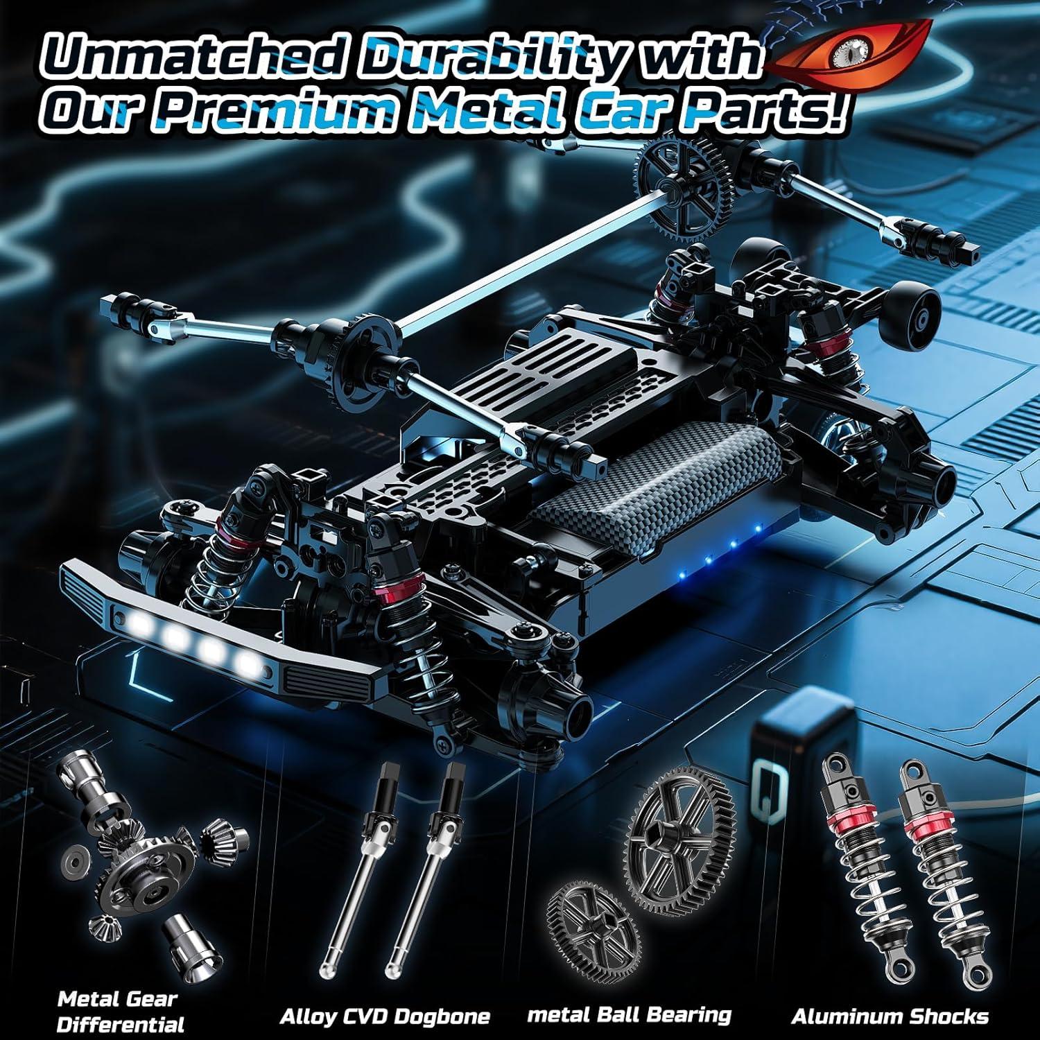 【Built Like a Beast – All-Metal, All-Terrain】Built tough with a full-metal drivetrain—metal adjustable shocks, differentials, and drive shafts—this RC truck is made to handle rough play. The 4×4 system and water-resistant ESC (IPX4) let it blast through puddles, climb hills, and tear over rocky trails without slowing down.