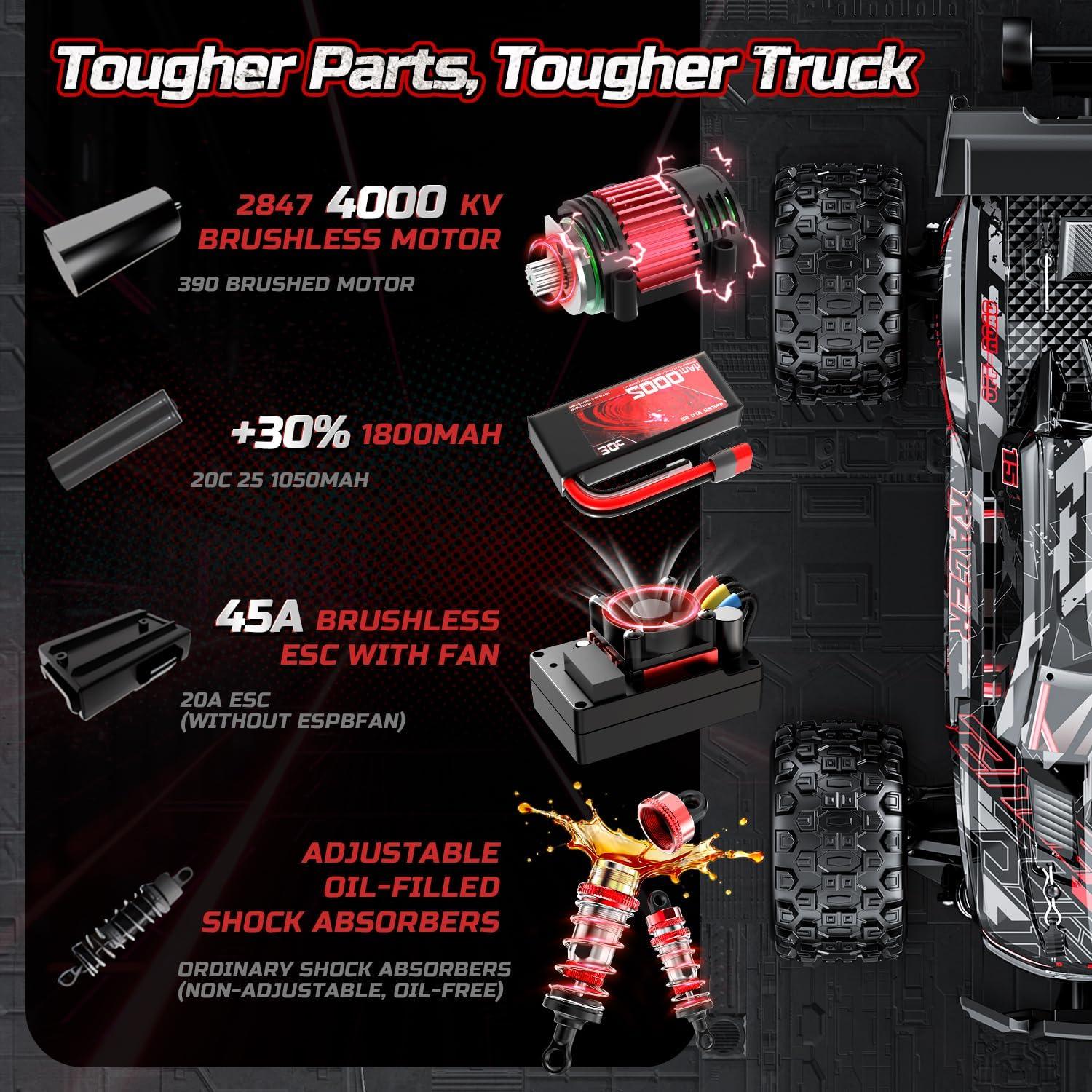 46+ MPH Fast Brushless RC Car for Adults Designed for serious speed lovers, this fast RC car is powered by a 2847 4000KV brushless motor and dual 3S LiPo batteries, reaching 46+ MPH (75+ KMH) with smooth, explosive acceleration built specifically for adult drivers.
